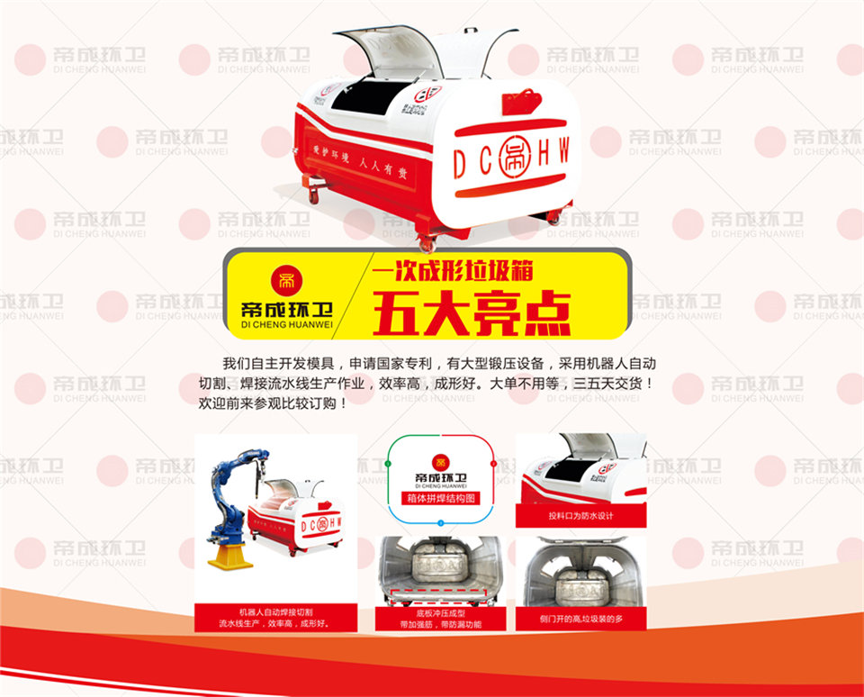 1.一次成型垃圾箱是我公司自主開發(fā)模具,申請(qǐng)**,我們有大型鍛壓設(shè)備,采用機(jī)器人自動(dòng)切割,焊接流水線生產(chǎn)作業(yè), 效率高,成型好。